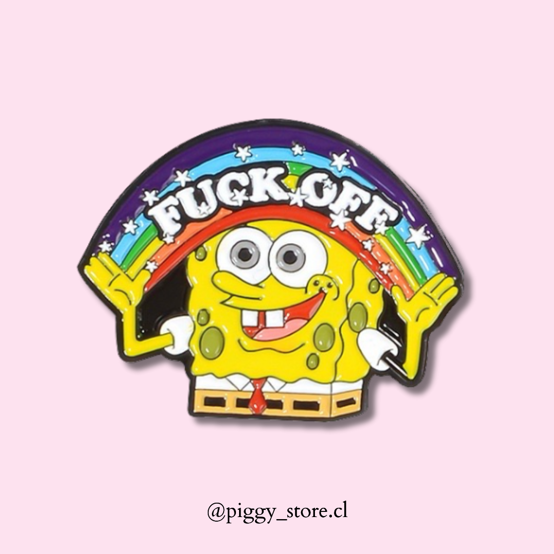 Pin metálico de Bob Esponja en su versión más sarcástica y divertida, acompañado de la frase «Fuck Off«. Fabricado con acrílico esmaltado de alta calidad y broche de goma reforzado, este diseño combina el icónico personaje animado con un toque audaz y moderno.