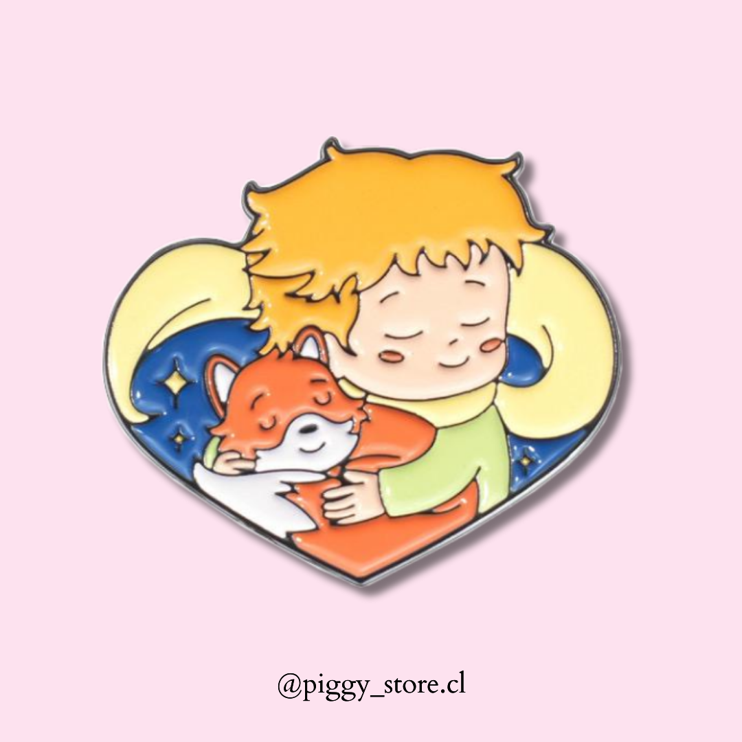 Pin metálico con terminaciones de esmaltado acrílico de la mejor calidad. Este pin captura una de las escenas más simbólicas de El Principito, donde el Zorro y el Principito, dos de los personajes más entrañables y filosóficos de la obra, se abrazan rodeados de un fondo que representa el vasto universo, simbolizando la conexión, la amistad y el amor universal. El diseño es un hermoso homenaje a la obra de Antoine de Saint-Exupéry y está lleno de detalles profundos y significativos.