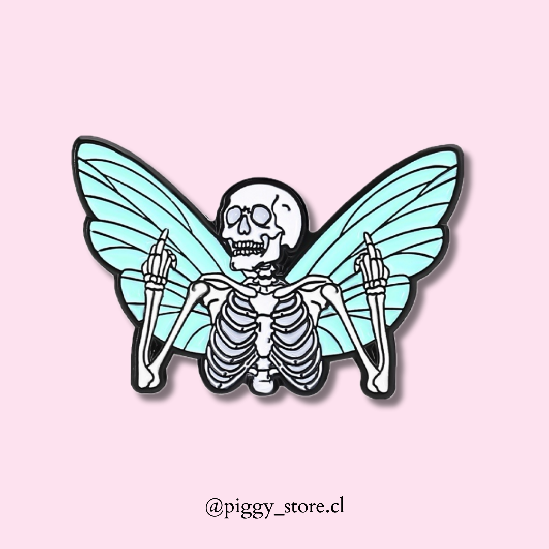 Pin metálico de un esqueleto humano con impresionantes alas extendidas que emergen de su espalda, que pueden ser de estilo gótico, angelical o incluso con un toque etéreo. Fabricado con acrílico esmaltado de alta calidad y broche de goma reforzado, este pin es ideal para quienes aprecian el arte oscuro, el simbolismo y los diseños con un toque surrealista.