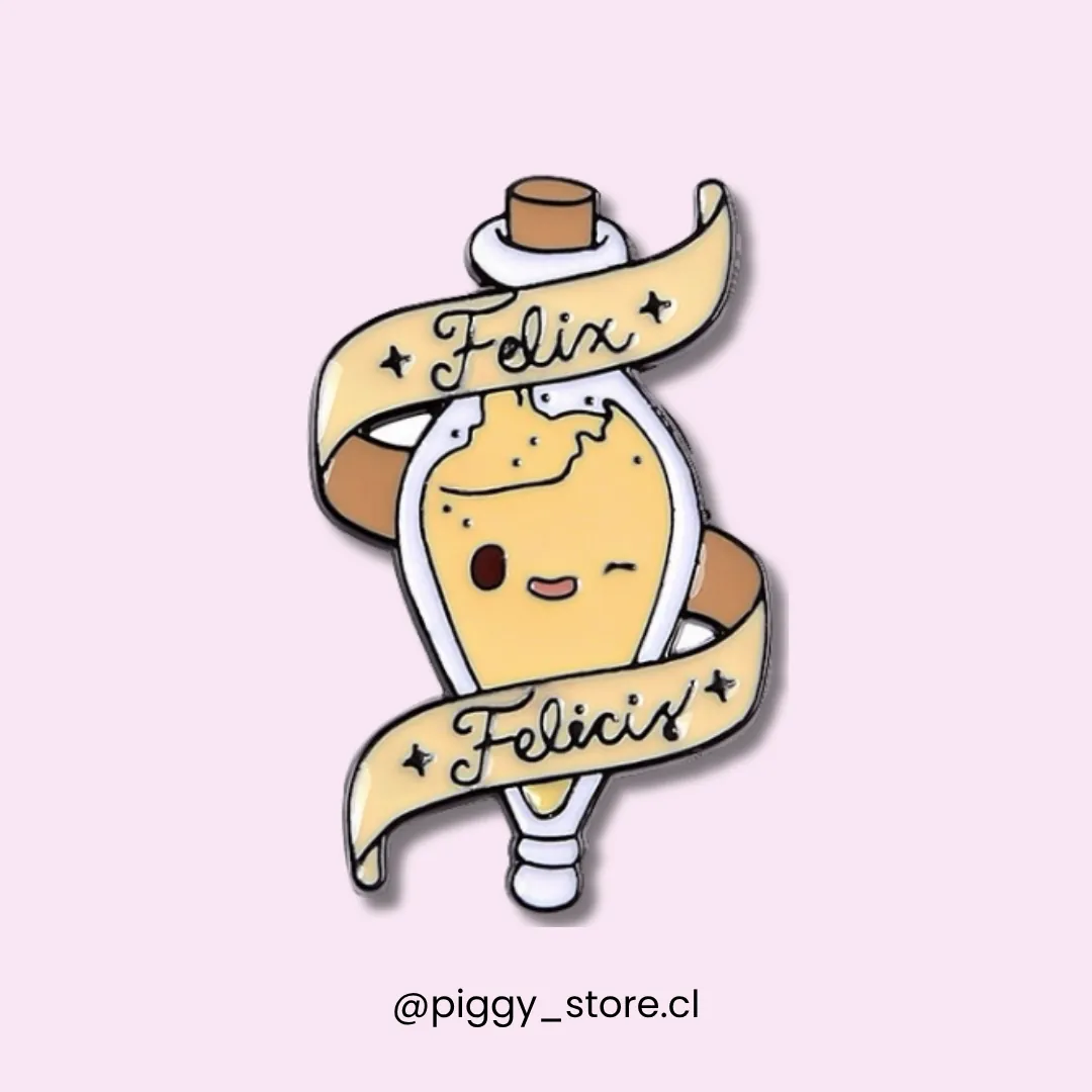 Pin metálico con diseño de la poción mágica Felix felicis, de la serie Harry Potter. Fabricado con acrílico esmaltado de alta calidad y broche de goma reforzado, es el accesorio ideal para quienes buscan llevar consigo un toque de magia y optimismo, perfecto para los fanáticos que desean una pizca de felicidad en su día a día.