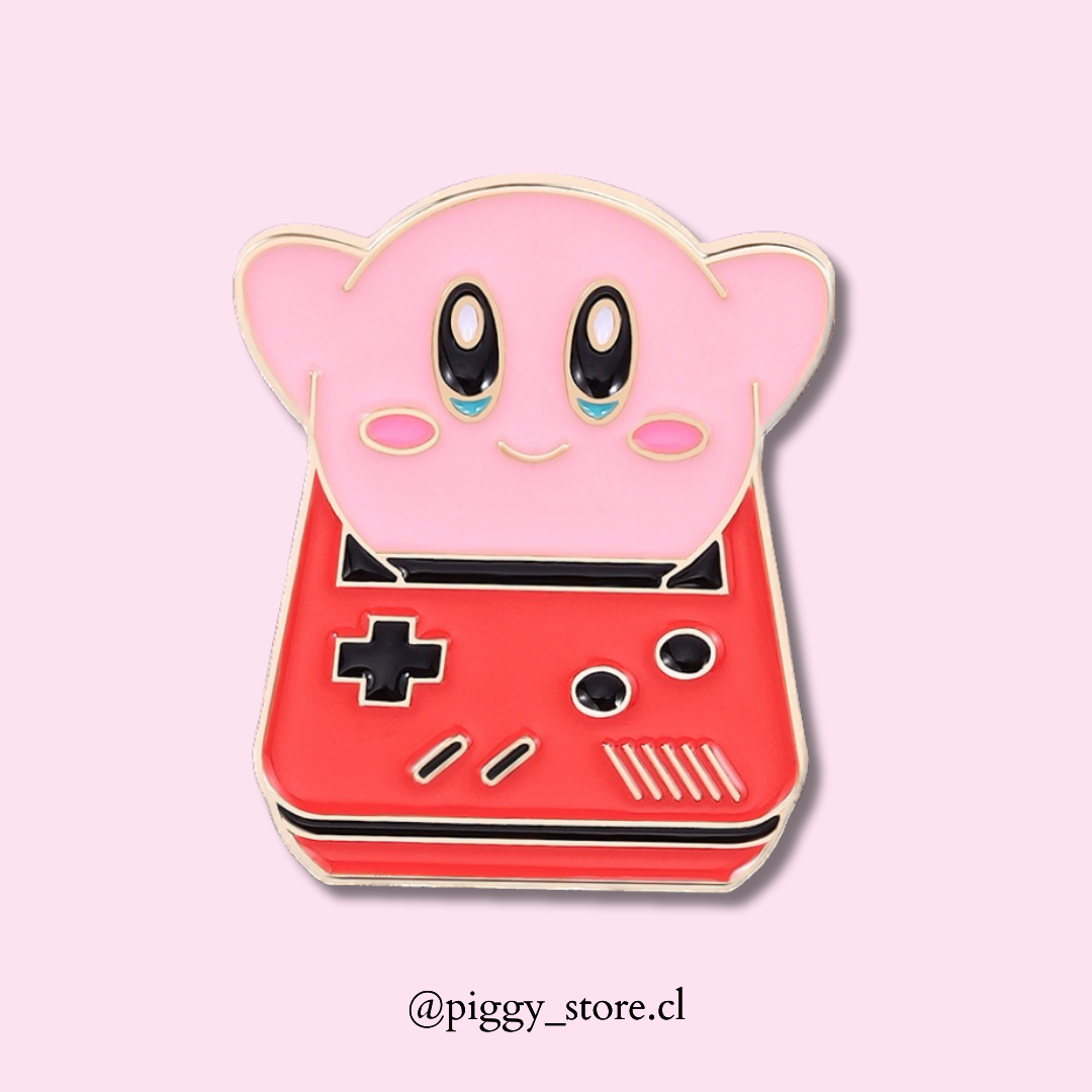 Pin metálico de Kirby descansando alegremente sobre una consola portátil retro, con detalles que evocan las clásicas consolas de los años 90. Fabricado con acrílico esmaltado de alta calidad y broche de goma reforzado, es ideal para los fans de Kirby y los entusiastas de los videojuegos retro.