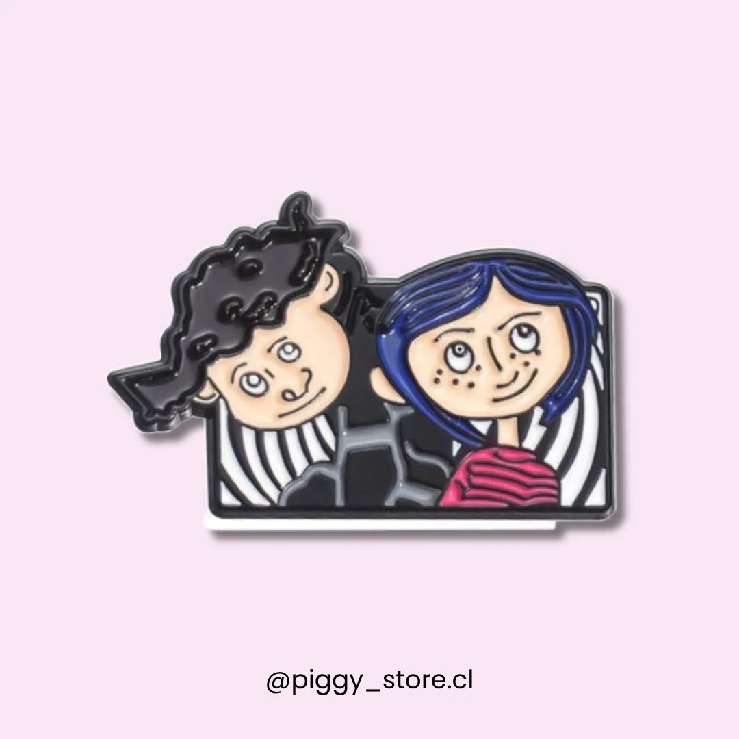 Pin metálico con terminaciones de esmaltado acrílico de la mejor calidad. Este pin combina la dulzura y la valentía de Gaby y Coraline, creando un diseño único que celebra a ambos personajes en una escena mágica y llena de detalles.